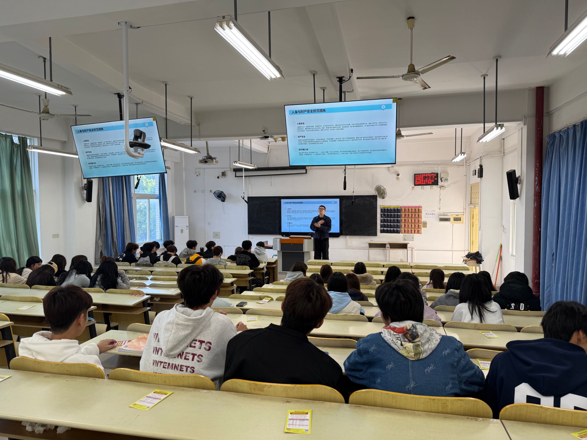 内容聚焦宿舍消防安全(重点讲解电器使用规范、火灾逃生技巧)、人身财产安全(防范校园及周边安全隐患)、离校返乡交通安全(强调乘车规范、行程报备)、防范金融风险等核心领域,尤其针对期末电信网络诈骗高发态势,利用案例细致讲解刷单返利、虚假中奖、校园贷等诈骗套路,普及金融风险防范知识,切实提升学生安全防范的“免疫力”和自我保护能力。