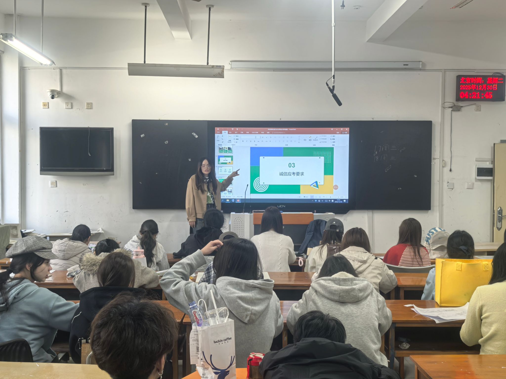 各班级辅导员牵头领学考试管理规定与违纪处分细则,结合典型案例从学业影响、个人信誉、未来发展等多维度解读不诚信的危害,引导学生深刻认知“诚信应考”不仅是准则,更是青春担当的重要体现,自觉树立“严谨治学、诚信立身”的求学理念。