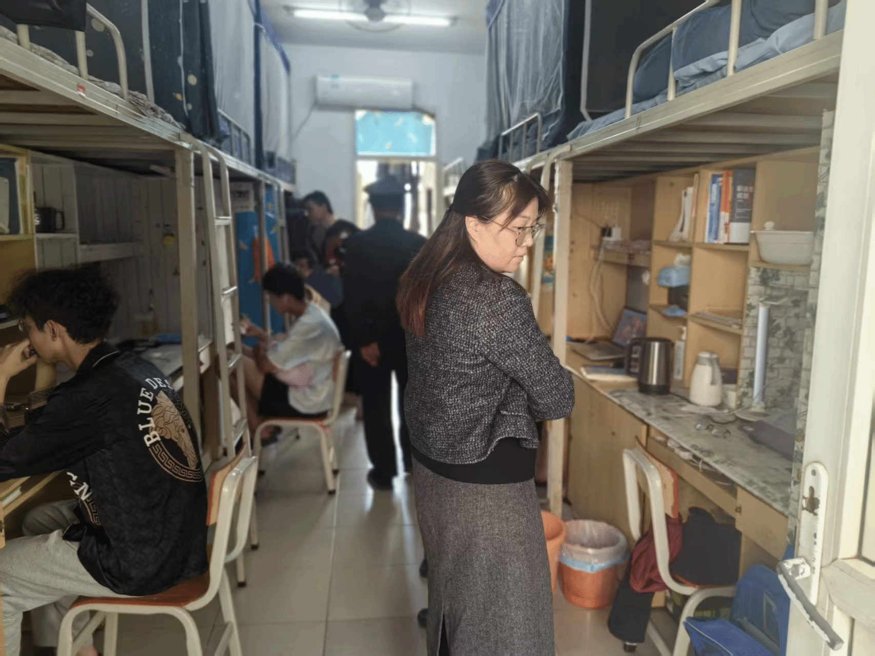 检查过程中,各辅导员分组深入学生宿舍,重点围绕消防安全与用电安全开展细致排查,着重核查是否存在违规使用大功率电器、私拉乱接电线、堆积快递纸箱等安全隐患。同时,对宿舍卫生清洁度、物品摆放规整度、日常通风频次等情况进行全面检查,督促同学们养成良好习惯,共同维护整洁有序的住宿环境。